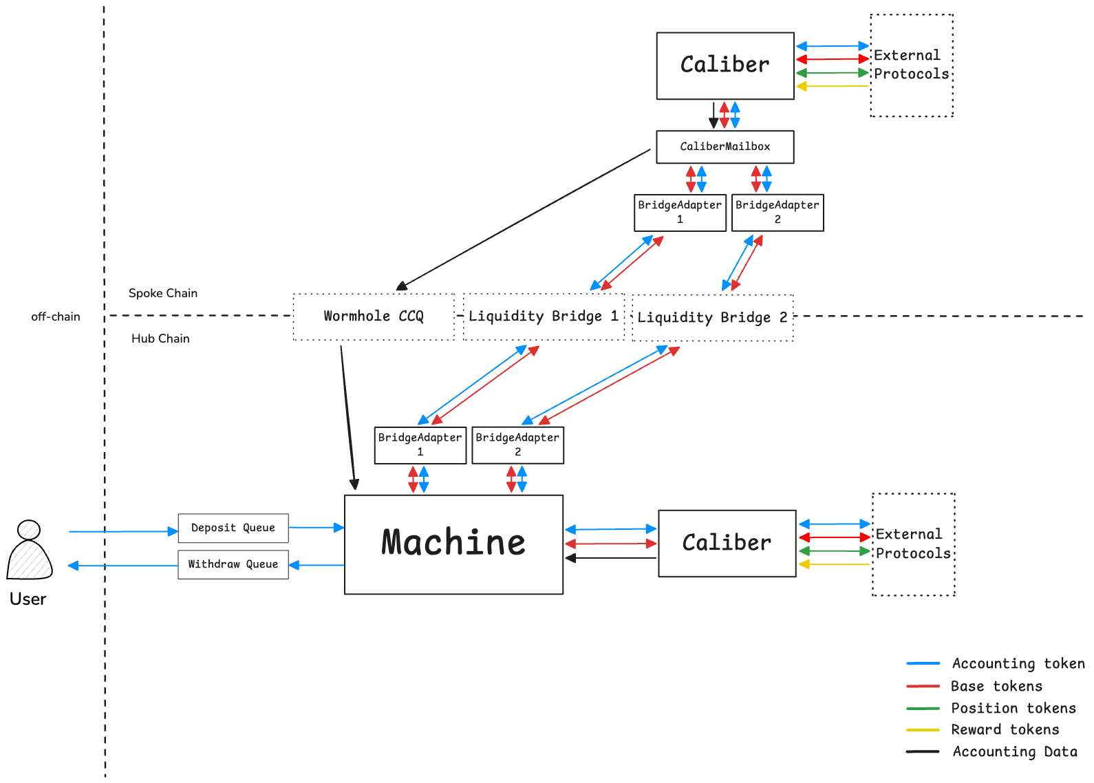 Users interact primarily with Machines through standard deposit and redemption functions. The Machine aggregates data from Calibers, which handle NAV calculation and risk controls on their respective chains.