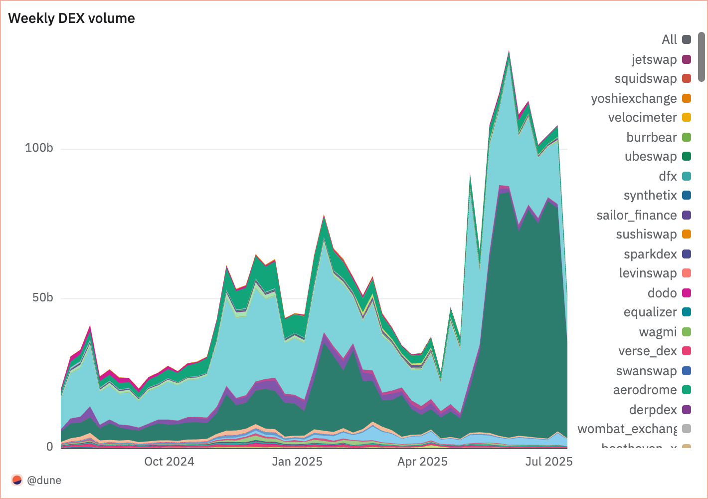 The numbers reveal the current state of decentralized trading. Weekly DEX volumes fluctuate dramatically from $20-40 billion during quiet periods to peaks above $140 billion during market rallies. The chart also shows the fragmented nature of the ecosystem, with dozens of separate protocols each capturing portions of total volume.