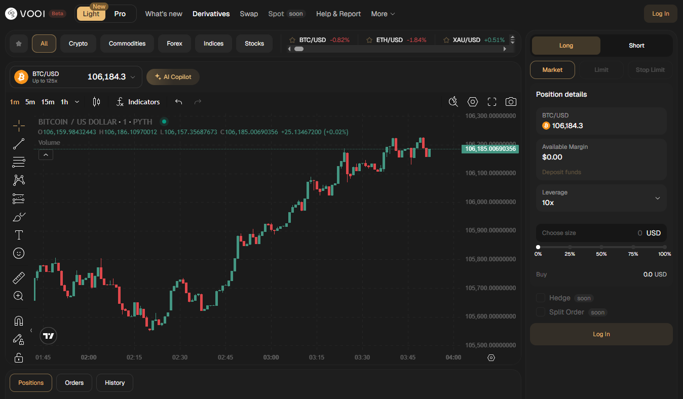 VOOI Pro (V1) remains available for advanced users who want full control, direct wallet interaction, and raw protocol access. VOOI Light (V2) does not replace that approach. It complements it. Together, they offer a dual-mode trading experience: one designed for precision, the other for accessibility.